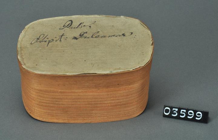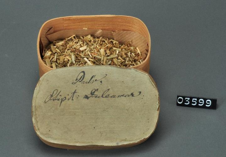 Rechteckige Spanschachtel mit abgerundeten Ecken und mit Papier, innen und außen, überzogenem Stülpdeckel. Mit schwarzer Tinte signiert. Enthält Bittersüßstengel.