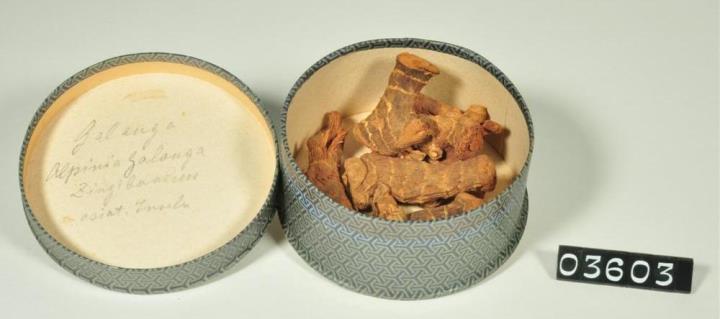 Runde Pulverschachtel aus Karton ohne Falz und Stülpdeckel. Dose mit gemustertem, dekorativem Fantasiepapier überzogen. Darauf Etikett der Stadtapotheke des Ignaz Peer I. Deckel innen und außen mit Bleistift beschriftet. Darin geschnittene Galgantwurzel.