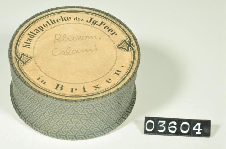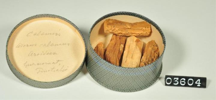 Runde Pulverschachtel aus Karton ohne Falz und Stülpdeckel. Dose mit gemustertem, dekorativem Fantasiepapier überzogen. Darauf Etikett der Stadtapotheke des Ignaz Peer I. Deckel innen und außen mit Bleistift beschriftet. Darin geschnittene Kalmuswurzel.