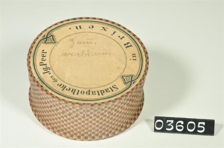 Runde Pulverschachtel aus Karton ohne Falz und Stülpdeckel. Dose mit gemustertem, dekorativem Fantasiepapier überzogen. Darauf Etikett der Stadtapotheke des Ignaz Peer I. Deckel innen und außen mit Bleistift beschriftet. Darin Gummiarabikum.