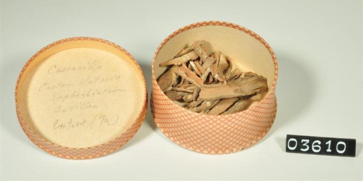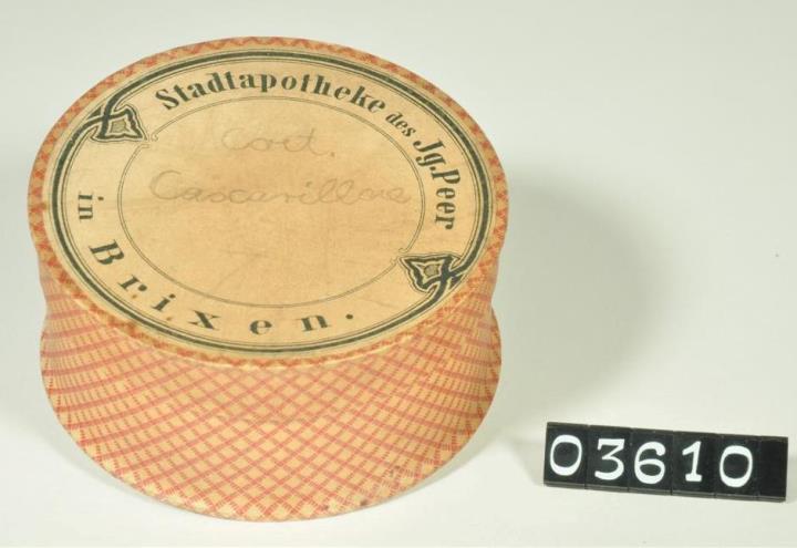 Runde Pulverschachtel aus Karton ohne Falz und Stülpdeckel. Dose mit gemustertem, dekorativem Fantasiepapier überzogen. Darauf Etikett der Stadtapotheke des Ignaz Peer I. Deckel innen und außen mit Bleistift beschriftet. Darin geschnittene Cascarillarinden.