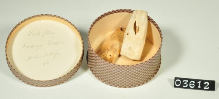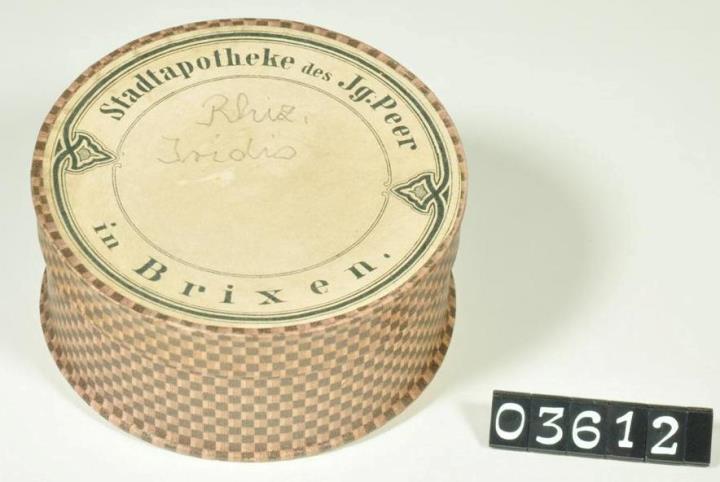 Runde Pulverschachtel aus Karton ohne Falz und Stülpdeckel. Dose mit gemustertem, dekorativem Fantasiepapier überzogen. Darauf Etikett der Stadtapotheke des Ignaz Peer I. Deckel innen und außen mit Bleistift beschriftet. Darin zwei Stücke Veilchenwurzel. Typisch das Loch am oberen Ende der dunkleren Wurzel. Dies diente zum Durchziehen eine Bandes, damit man es dem zahnenden Kind wie ine Halskette anziehen konnte.