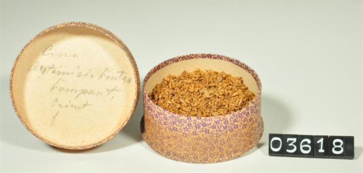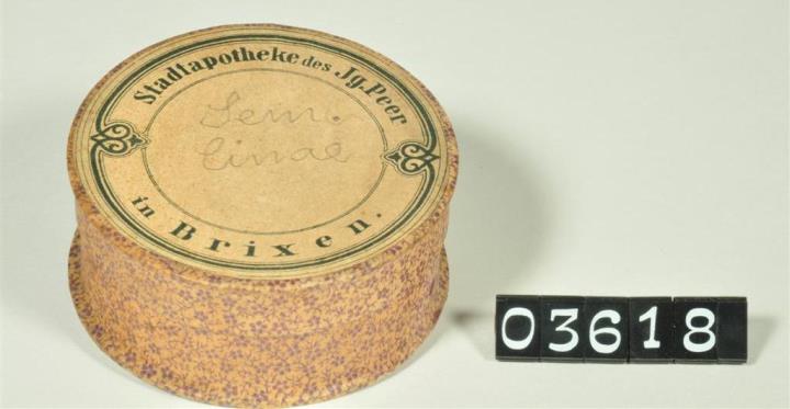 Runde Pulverschachtel aus Karton ohne Falz und Stülpdeckel. Dose mit braunem Glanzpapier überzogen. Darauf Etikett der Stadtapotheke des Ignaz Peer I. Deckel innen und außen mit Bleistift beschriftet. Darin Wurmsamen, bzw. Cinasamen. Meistens besteht, auch der beste, nur aus kleinen, länglichten, leichten, gelbgrünlichen Blüthenköpfchen, mit einigen Stielchen vermischt, von einer strauchartigen Pflanze, Artemisia Contra, welche im Orient wächst.