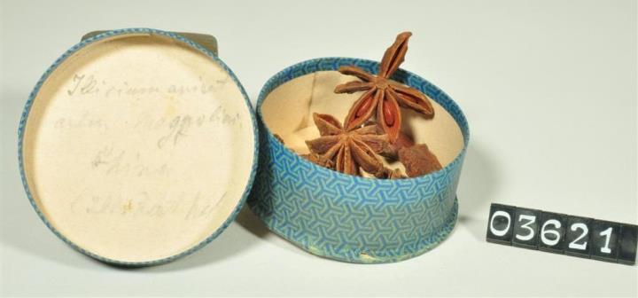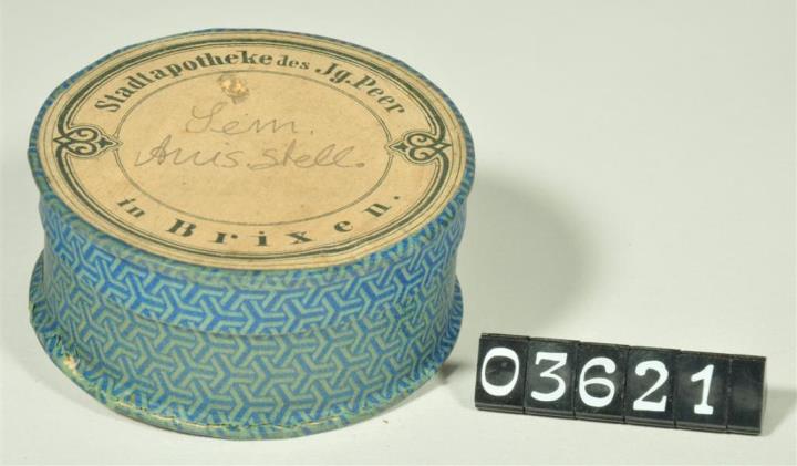 Runde Pulverschachtel aus Karton ohne Falz und Stülpdeckel. Dose mit gemustertem, dekorativem Fantasiepapier überzogen. Darauf Etikett der Stadtapotheke des Ignaz Peer I. Deckel innen und außen mit Bleistift beschriftet. Darin vier Stück ganzer Sternanis.