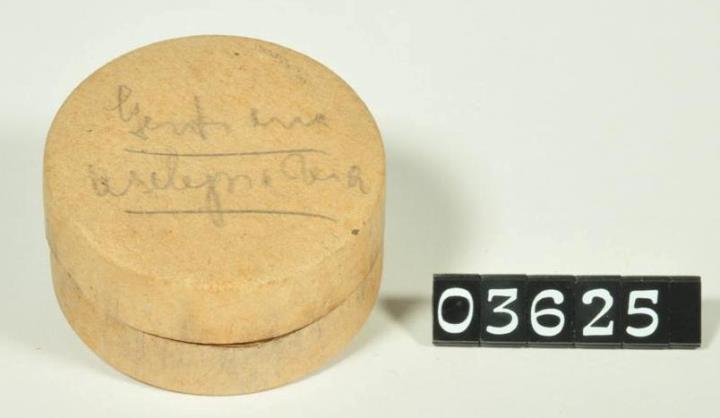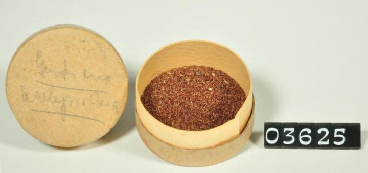 Runde braune Pulverschachtel aus Karton mit Falz und Stülpdeckel. Deckel außen von Ignaz Peer II mit Bleistift beschriftet. Enthält Samen des Schwalbenwurz-Enzians.