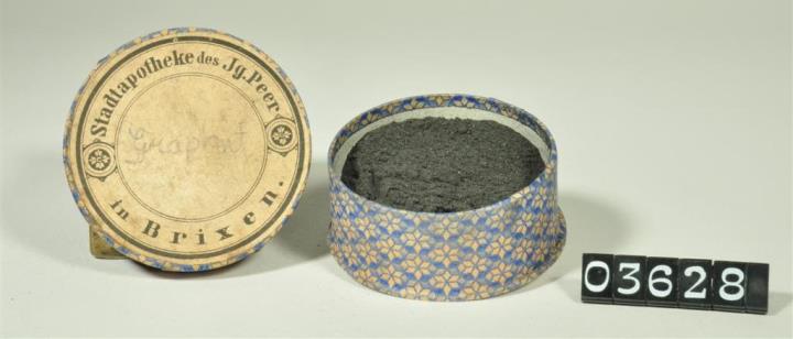 Runde Pulverschachtel aus Karton ohne Falz und Stülpdeckel. Dose mit gemustertem, dekorativem Fantasiepapier überzogen. Darauf Etikett der Stadtapotheke des Ignaz Peer I. Deckel innen und außen mit Bleistift beschriftet. Halb gefüllt mit Grafit.