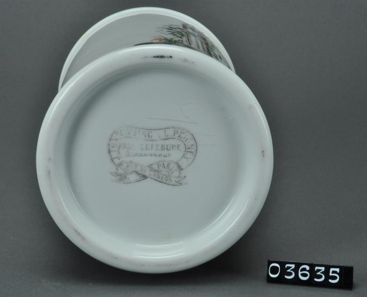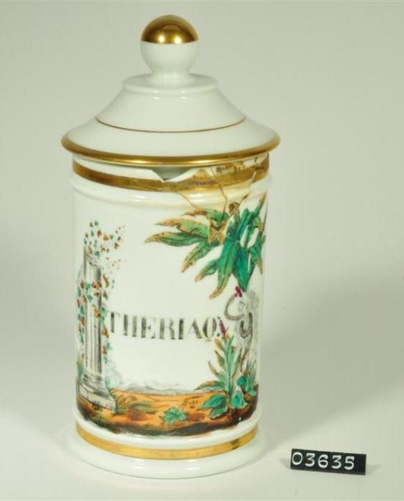 Zylindrischer dünnwandiger Salbentopf aus Porzellan mit Standring und glockenförmigen Hohldeckel mit Steckzarge und massivem, zentralem runden Knauf. Hohlkehlen vergoldet. Signiert und reich farblich dekoriert. Am Boden Manufakturstempel: Paul Lefébure aus Paris. Enthielt Theriak.