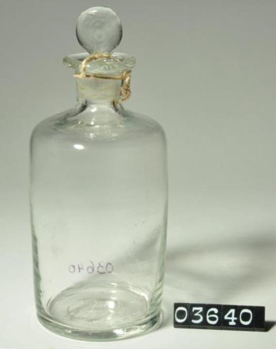 Mundgeblasener, zylindrischer, leicht konischer, farbloser Flaschenkörper mit runder Schulter und kurzem Zylinderhals. Ausgebogener, ausgeschliffener Rand (ausladend) mit Schliffstopfen. Boden mit unregelmäßigem Hefteisenabriss.Schliffstopfen mit zusammengedrücktem runden Knauf. Schliffstopfen ist mit Spagat am Flaschenhals angebunden.