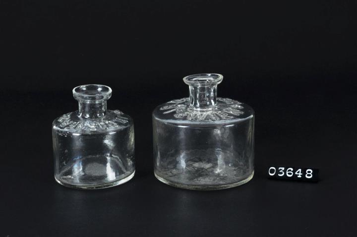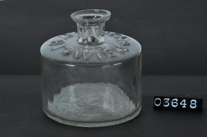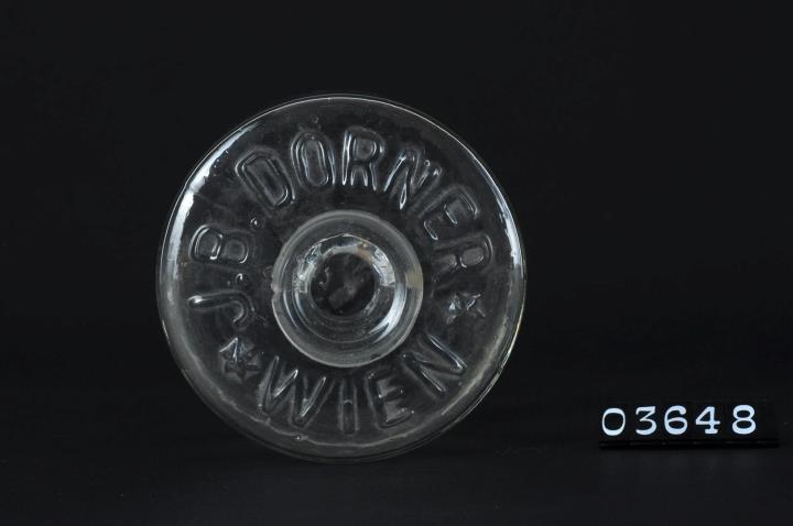 Zylindrische, farblose Glasflasche mit flacher Schulter und Prägung auf dieser Schulter: "J.B.Dorner Wien". Maschinell hergestellt, manuell nachgearbeitete, ausladende Mündung mit geschliffenem Rand.