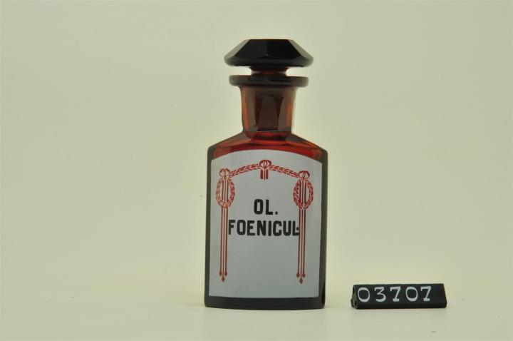 Ovalgriffige, halb geschliffene Standflasche aus braunem Kristallglas. Schulter, Hals, Boden und Stopfen geschliffen und poliert. Eingebranntes, weißes Emailleschild über die gesamte Vorderwand mit jugendstilähnlicher, rotbrauner Randdekoration (Blattgirlande mit Bändern). Signiert.