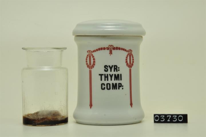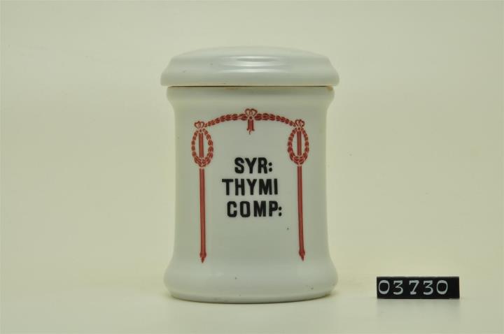Zylinderförmiger Porzellantiegel mit Stülpdeckelrand, geschweiftem Rand und geschweiftem Fuß. Stülpdeckel mit Kehlung. Standring. Standboden plan. Jugendstilähnliche, rotbraune Randdekoration (Blattgirlande mit Bändern). Eingebrannte schwarze Signatur.