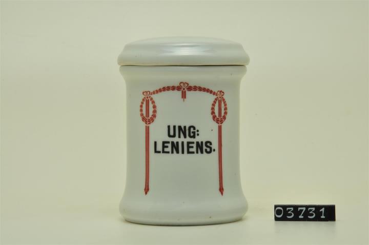 Zylinderförmiger Porzellantiegel mit Stülpdeckelrand, geschweiftem Rand und geschweiftem Fuß. Stülpdeckel mit Kehlung. Standring. Standboden plan. Jugendstilähnliche, rotbraune Randdekoration (Blattgirlande mit Bändern). Eingebrannte schwarze Signatur.