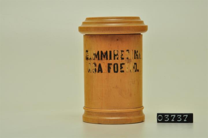 Hellbraune, zylinderförmige Holzdose (Holzbüchse) mit abgesetztem Standfuß bestehend aus Halbrundstab, Kehlung und geradem Abschluss. Flacher Stülpdeckel mit gerundetem Deckelrand und darüber zwei Kehlungen. Schwarz signiert