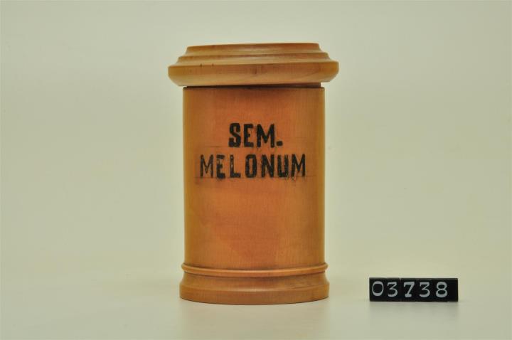 Hellbraune, zylinderförmige Holzdose (Holzbüchse) mit abgesetztem Standfuß bestehend aus Halbrundstab, Kehlung und geradem Abschluss. Flacher Stülpdeckel mit gerundetem Deckelrand und darüber zwei Kehlungen. Schwarz signiert