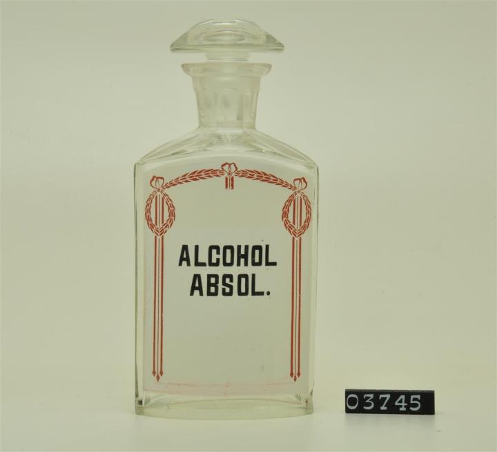 Ovalgriffige, halb geschliffene, farblose Standflasche. Schulter, Hals, Stopfen und Boden geschliffen und poliert. Eingebranntes, weißes Emailleschild über die gesamte Vorderwand mit jugendstilähnlicher, rotbrauner Randdekoration (Blattgirlande mit Bändern). Schwarz signiert.