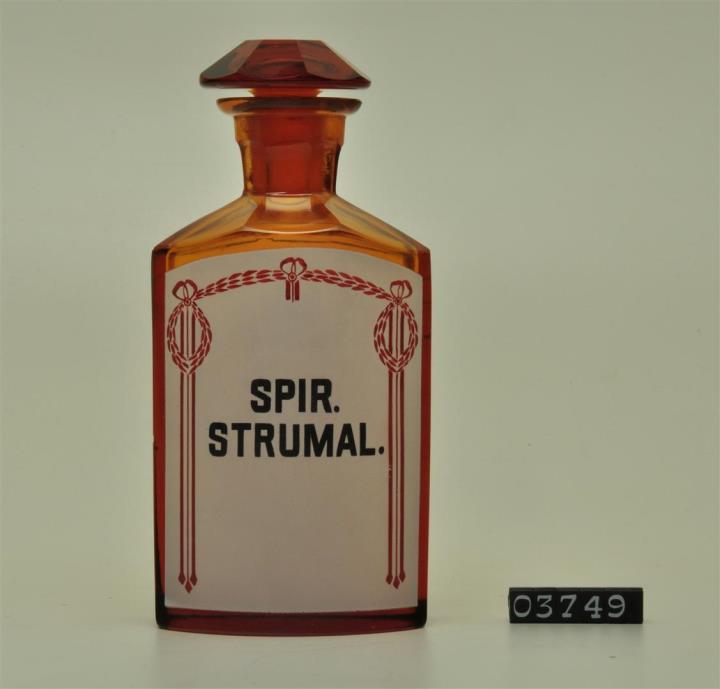 Ovalgriffige, halb geschliffene, braune Standflasche. Schulter, Hals, Stopfen und Boden geschliffen und poliert. Eingebranntes, weißes Emailleschild über die gesamte Vorderwand mit jugendstilähnlicher, rotbrauner Randdekoration (Blattgirlande mit Bändern). Schwarz signiert.