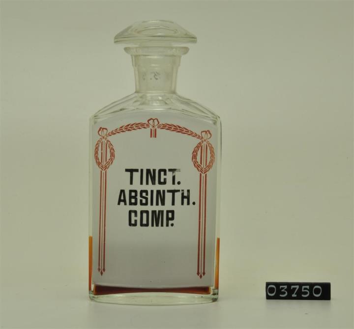 Ovalgriffige, halb geschliffene, farblose Standflasche. Schulter, Hals, Stopfen und Boden geschliffen und poliert. Eingebranntes, weißes Emailleschild über die gesamte Vorderwand mit jugendstilähnlicher, rotbrauner Randdekoration (Blattgirlande mit Bändern). Schwarz signiert.