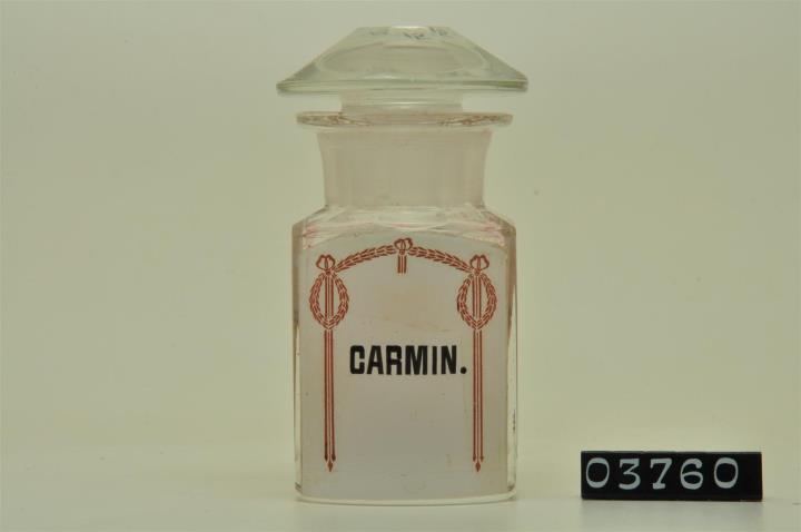 Ovalgriffiges, halb geschliffenes, farbloses Pulverglas. Schulter, Hals, Stopfen und Boden geschliffen und poliert. Eingebranntes, weißes Emailleschild über die gesamte Vorderwand mit jugendstilähnlicher, rotbrauner Randdekoration (Blattgirlande mit Bändern). Signiert.
