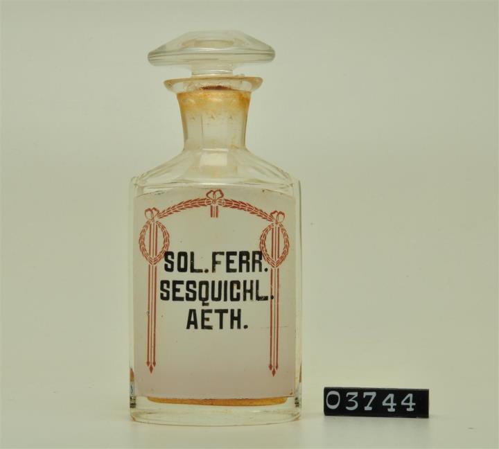 Ovalgriffige, halb geschliffene Standflasche aus farblosem Kristallglas. Schulter, Hals, Boden und Stopfen geschliffen und poliert. Eingebranntes, weißes Emailleschild über die gesamte Vorderwand mit jugendstilähnlicher, rotbrauner Randdekoration (Blattgirlande mit Bändern). Signiert.