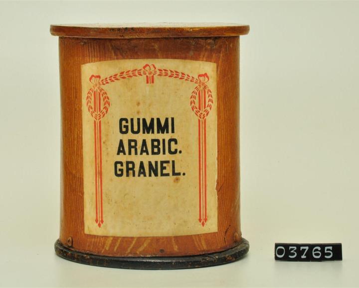 Braune, zylinderförmige Standdose aus maseriertem und lackiertem Hartpapier, Leicht vorstehender, dunkelbrauner Holzboden und vorstehender, flacher Steckdeckel aus Holz. Schwarz signiert.