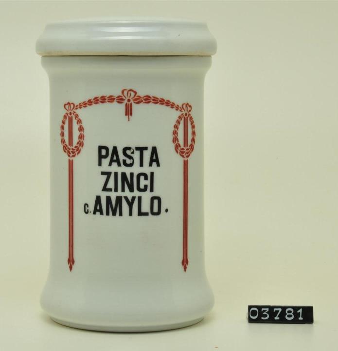 Zylinderförmiger Porzellantiegel mit Stülpdeckelrand, geschweiftem Rand und geschweiftem Fuß. Stülpdeckel mit Kehlung. Standring. Standboden plan. Jugendstilähnliche, rotbraune Randdekoration (Blattgirlande mit Bändern). Eingebrannte schwarze Signatur.