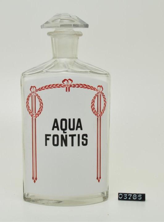 Ovalgriffige, halb geschliffene Standflasche aus farblosem Kristallglas. Schulter, Hals, Boden und Schliffstopfen geschliffen und poliert. Eingebranntes, weißes Emailleschild über die gesamte Vorderwand mit jugendstilähnlicher, rotbrauner Randdekoration (Blattgirlande mit Bändern). Signiert.