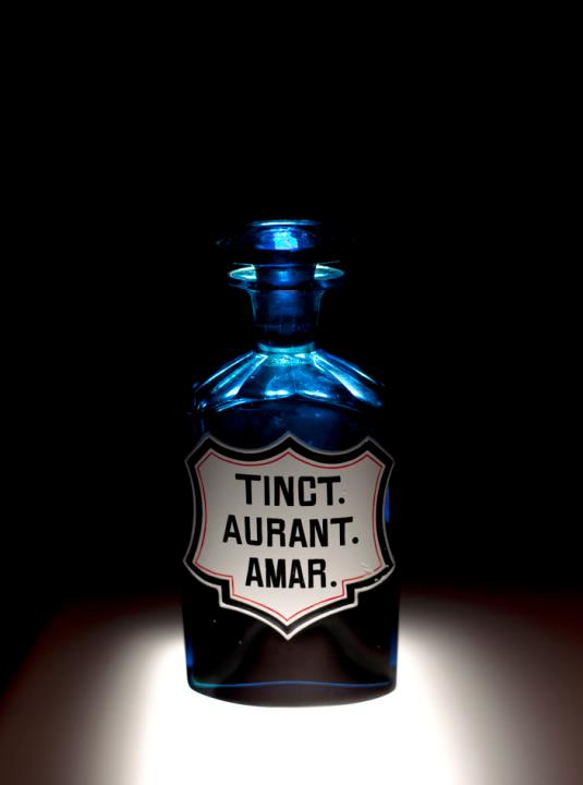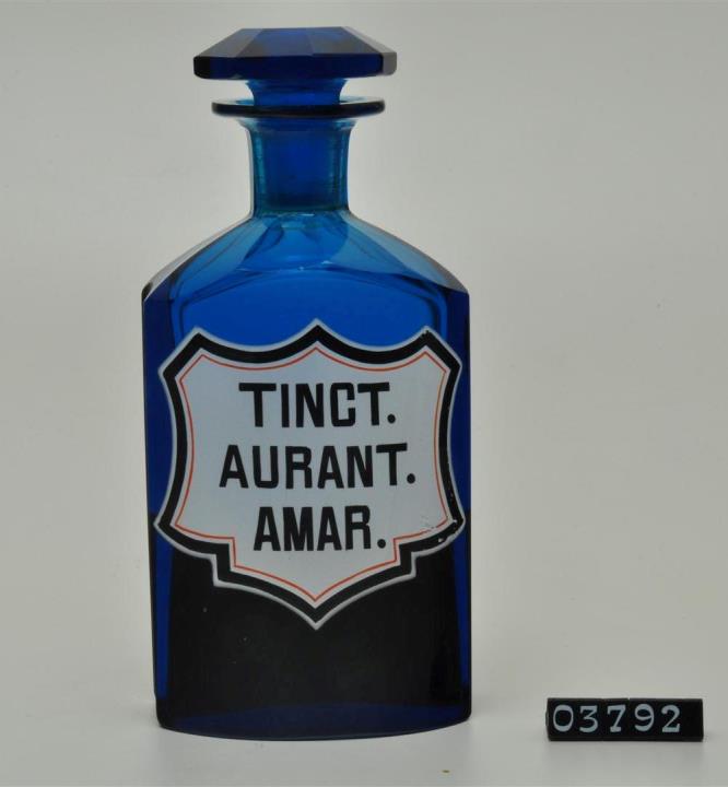 Ovalgriffige, gepreßte, aquamarinblaue Enghalsflasche. Mit Schliffstopfen, geschliffen. Eingebranntes, geschwungenes, weißes Emailleschild mit rotem und schwarzem Rand. Schwarz signiert. Enthält Pomeranzentinktur.