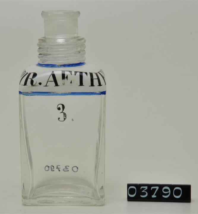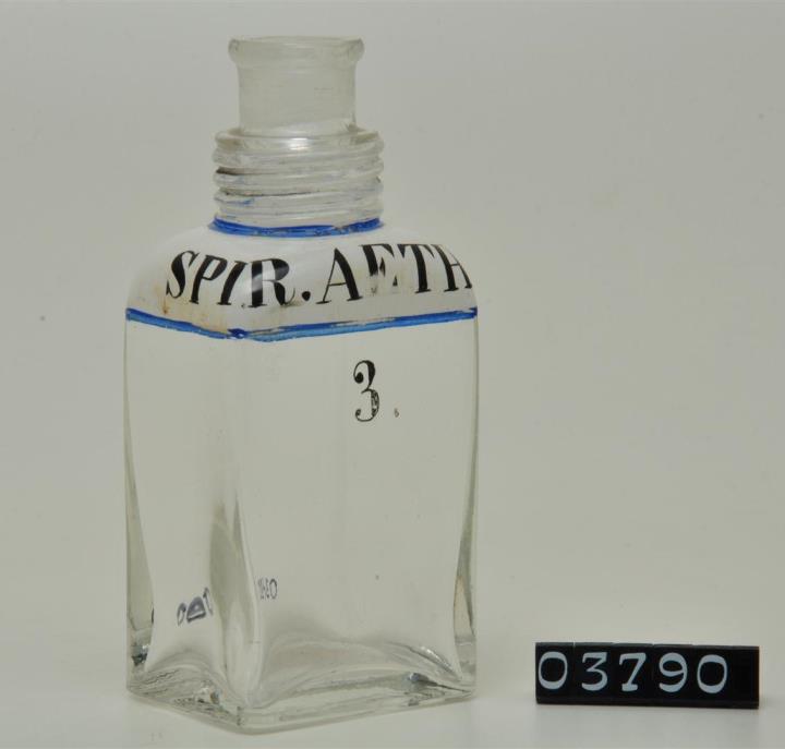 Im Querschnitt rechteckige, farblose Flasche. Abgeflachte emaillierte Schulter mit eingebranntem Produktnamen. Verdickter Mündungsrand. Am Hals Gewinde für Kappe