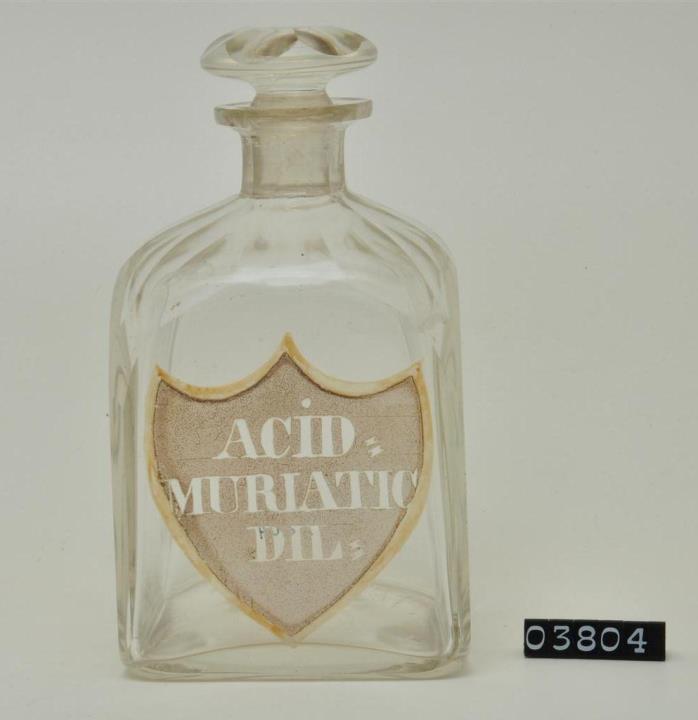 Farblose Vierkantflasche mit Stopfen, Hefteisenabriss weggeschliffen. Bis zum Halsansatz überstochen. Unregelmäßig ausgebogener, leicht verdickter Mündungsrand. Schulter, Hals, Stopfen, Seiten, Kanten und Boden geschliffen und poliert. Eingebranntes, weißes Emailleschild in der Form eines Schweizer Schildes mit goldenem Rand. Signiert.