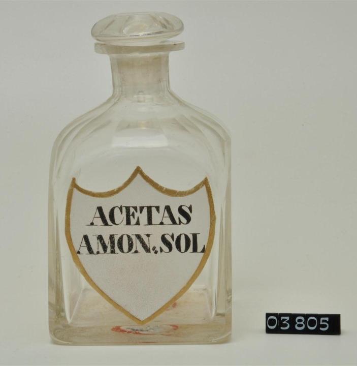 Farblose Vierkantflasche mit Stopfen, Hefteisenabriss weggeschliffen. Bis zum Halsansatz überstochen. Unregelmäßig ausgebogener, leicht verdickter Mündungsrand. Schulter, Hals, Stopfen, Seiten, Kanten und Boden geschliffen und poliert. Eingebranntes, weißes Emailleschild in der Form eines Schweizer Schildes mit goldenem Rand. Signiert.