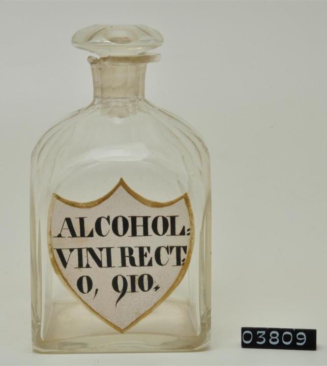 Farblose Vierkantflasche mit Stopfen, Hefteisenabriss weggeschliffen. Bis zum Halsansatz überstochen. Unregelmäßig ausgebogener, leicht verdickter Mündungsrand. Schulter, Hals, Stopfen, Seiten, Kanten und Boden geschliffen und poliert. Eingebranntes, weißes Emailleschild in der Form eines Schweizer Schildes mit goldenem Rand. Signiert.
