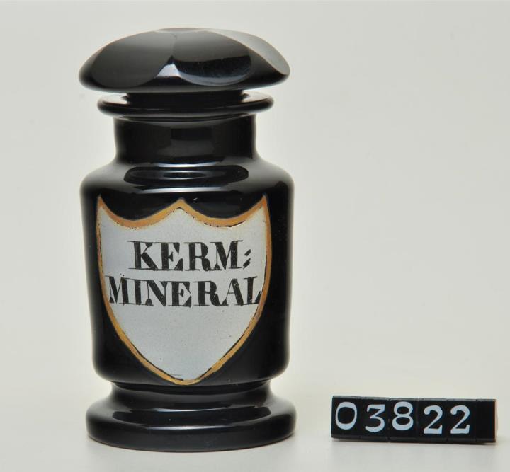 Schwarzes, rundes Pulverglas (Hyalithglas = siehe Bemerkungen) mit Schliffstopfen (Massivstopfen) mit Facettenschliff. Fuß mit Hefteisenabriss und nachgeschliffenem Boden. Ausladender, flacher Mündungsrand. Eingebranntes, weißes Emailleschild in der Form eines Schweizer Schildes mit goldenem Rand. Schwarz signiert.