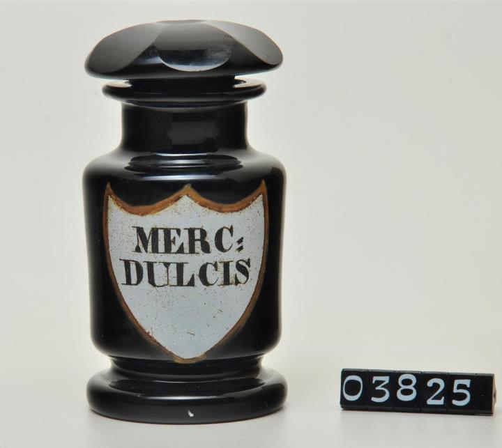 Schwarzes, rundes Pulverglas (Hyalithglas = siehe Bemerkungen) mit Schliffstopfen (Massivstopfen) mit Facettenschliff. Fuß mit Hefteisenabriss und nachgeschliffenem Boden. Ausladender, flacher Mündungsrand. Eingebranntes, weißes Emailleschild in der Form eines Schweizer Schildes mit goldenem Rand. Schwarz signiert.