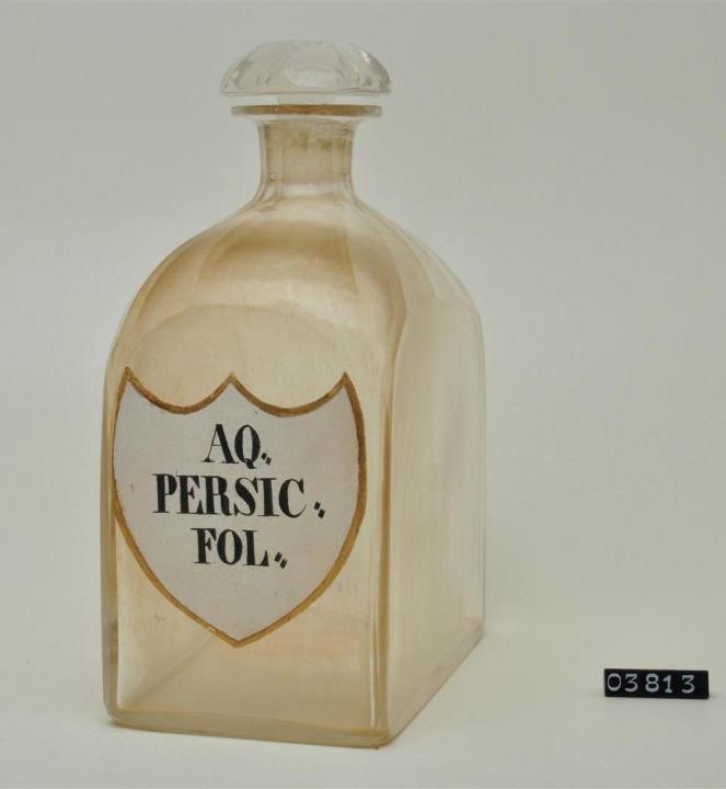 Farblose Vierkantflasche mit Stopfen und Hefteisenabriss. Bis zum Halsansatz überstochen. Unregelmäßig ausgebogener, leicht verdickter Mündungsrand. Schulter, Hals, Stopfen, Seiten, Kanten und Boden geschliffen und poliert. Eingebranntes, weißes Emailleschild in der Form eines Schweizer Schildes mit goldenem Rand. Schwarz signiert.