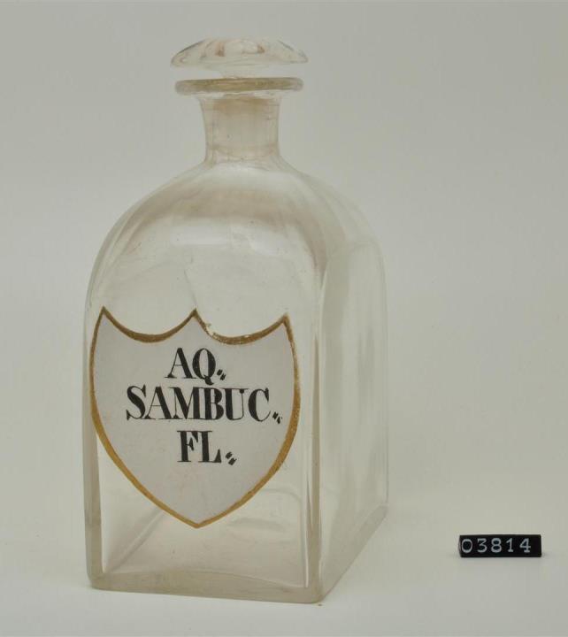 Farblose Vierkantflasche mit Stopfen und Hefteisenabriss. Bis zum Halsansatz überstochen. Unregelmäßig ausgebogener, leicht verdickter Mündungsrand. Schulter, Hals, Stopfen, Seiten, Kanten und Boden geschliffen und poliert. Eingebranntes, weißes Emailleschild in der Form eines Schweizer Schildes mit goldenem Rand. Schwarz signiert.