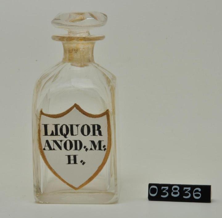 Farblose Vierkantflasche mit Stopfen, Enghalsflasche, Boden matt geschliffen. Hefteisenabriss teilweise weggeschliffen. Bis zum Halsansatz überstochen. Unregelmäßig ausgebogener, leicht verdickter Mündungsrand. Schulter, Hals, Stopfen, Seiten, Kanten und Boden geschliffen und poliert. Eingebranntes, weißes Emailleschild in der Form eines Schweizer Schildes mit goldenem Rand. Schwarz signiert.