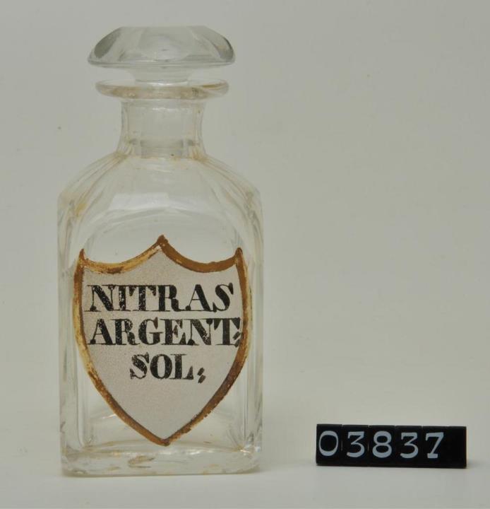 Farblose Vierkantflasche, Enghals, mit Stopfen, Hefteisenabriss teilweise weggeschliffen. Bis zum Halsansatz überstochen. Unregelmäßig ausgebogener, leicht verdickter Mündungsrand. Schulter, Hals, Stopfen, Seiten, Kanten und Boden geschliffen und poliert. Eingebranntes, weißes Emailleschild in der Form eines Schweizer Schildes mit goldenem Rand. Schwarz signiert.