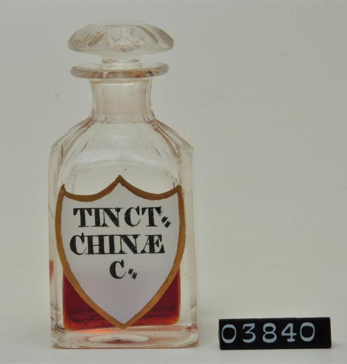 Farblose Vierkantflasche, Enghals, mit Stopfen, Hefteisenabriss teilweise weggeschliffen. Bis zum Halsansatz überstochen. Unregelmäßig ausgebogener, leicht verdickter Mündungsrand. Schulter, Hals, Stopfen, Seiten, Kanten und Boden geschliffen und poliert. Eingebranntes, weißes Emailleschild in der Form eines Schweizer Schildes mit goldenem Rand. Schwarz signiert.