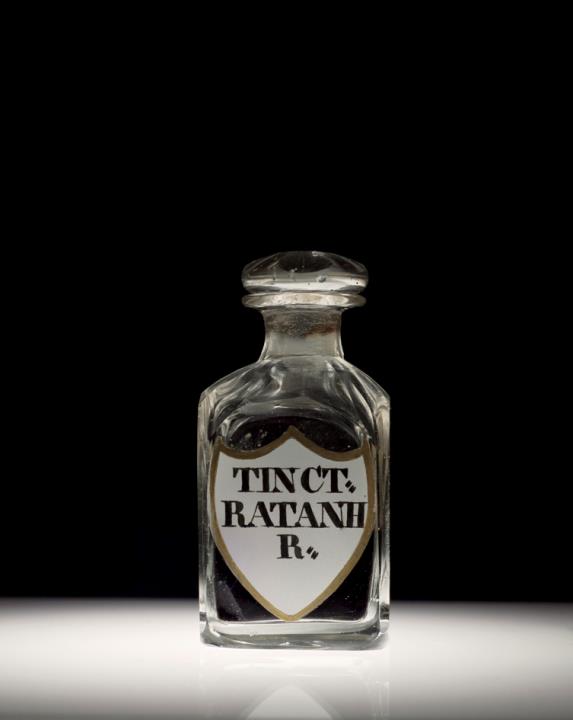 Farblose Vierkantflasche, Enghals, mit Stopfen, Hefteisenabriss teilweise weggeschliffen. Bis zum Halsansatz überstochen. Unregelmäßig ausgebogener, leicht verdickter Mündungsrand. Schulter, Hals, Stopfen, Seiten, Kanten und Boden geschliffen und poliert. Eingebranntes, weißes Emailleschild in der Form eines Schweizer Schildes mit goldenem Rand. Schwarz signiert.