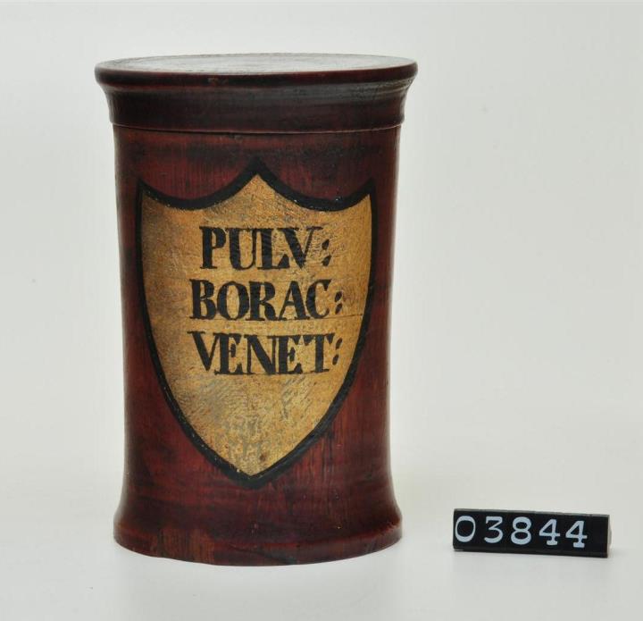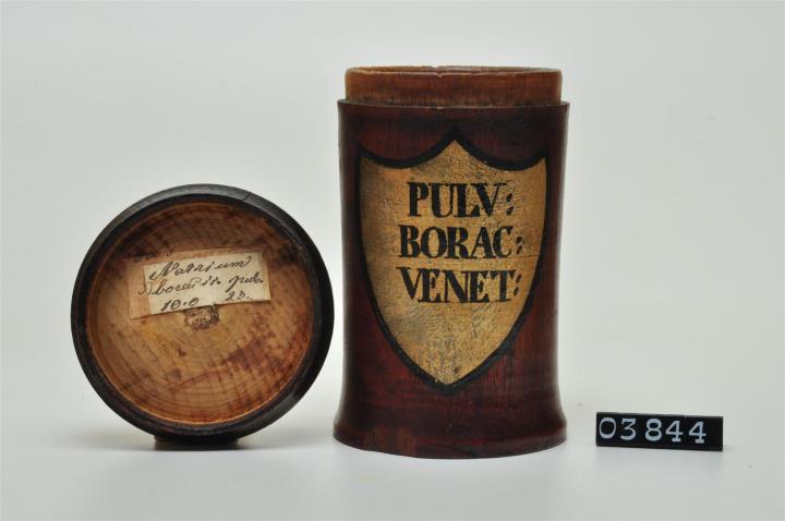 Braune, zylinderförmige gedrechselte Holzdose (Holzbüchse) mit abgesetztem Standfuß und eingepaßtem, kaum gewölbtem Stülpdeckel und nach außen gebogenem Profil. Auf der Schauseite schildförmiges und goldfarbenes Beschriftungsfeld mit schwarzem Rand. Schwarz signiert