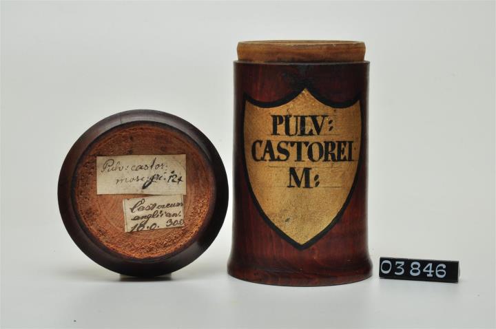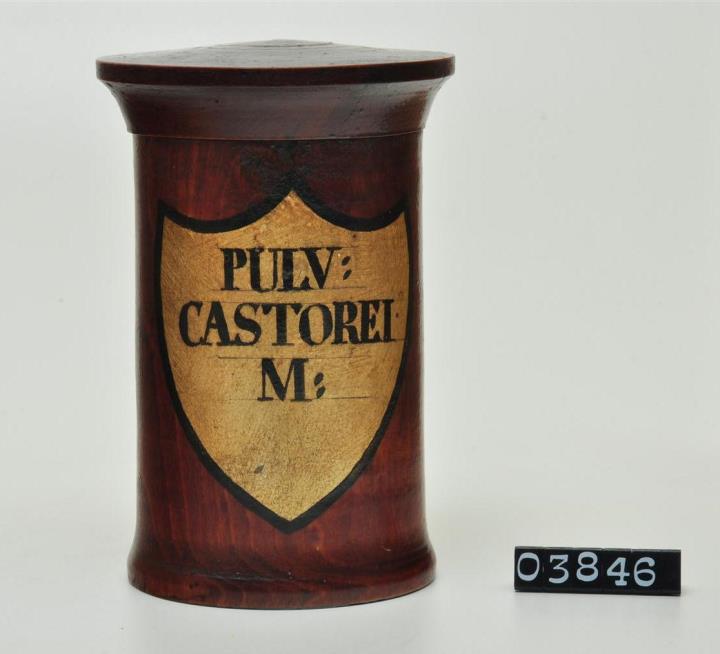 Braune, zylinderförmige gedrechselte Holzdose (Holzbüchse) mit abgesetztem Standfuß und eingepaßtem, kaum gewölbtem Stülpdeckel und nach außen gebogenem Profil. Auf der Schauseite schildförmiges und goldfarbenes Beschriftungsfeld mit schwarzem Rand. Schwarz signiert