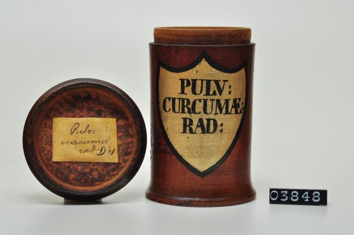 Braune, zylinderförmige, gedrechselte Holzdose (Holzbüchse) mit abgesetztem Standfuß und eingepaßtem, kaum gewölbtem Stülpdeckel und nach außen gebogenem Profil. Auf der Schauseite schildförmiges und goldfarbenes Beschriftungsfeld mit schwarzem Rand. Schwarz signiert.