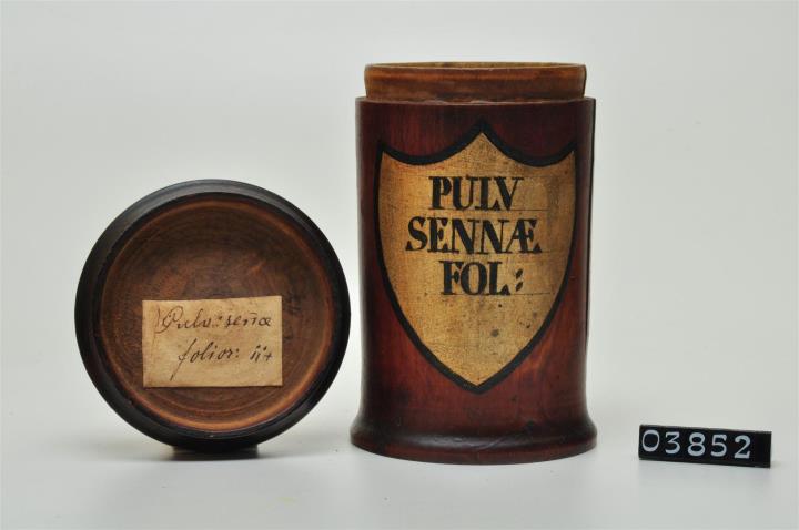 Braune, zylinderförmige Holzdose (Holzbüchse) mit abgesetztem Standfuß und eingepaßtem, kaum gewölbtem Stülpdeckel und nach außen gebogenem Profil. Auf der Schauseite schildförmiges und goldfarbenes Beschriftungsfeld mit schwarzem Rand. Schwarz signiert.