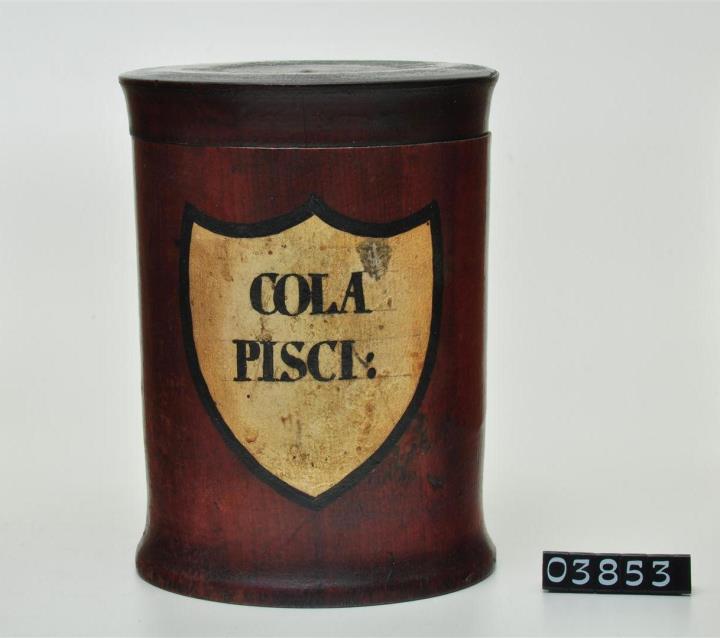 Braune, zylinderförmige gedrechselte Holzdose (Holzbüchse) mit ausgestelltem Standfuß und eingepaßtem, flachem Stülpdeckel und nach außen gebogenem Profil. Auf der Schauseite schildförmiges und goldfarbenes Beschriftungsfeld mit schwarzem Rand. Schwarz signiert.