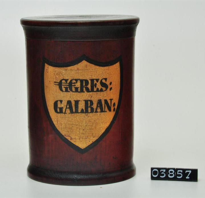 Braune, zylinderförmige gedrechselte Holzdose (Holzbüchse) mit ausgestelltem Standfuß und eingepaßtem, flachem Stülpdeckel und nach außen gebogenem Profil. Auf der Schauseite schildförmiges und goldfarbenes Beschriftungsfeld mit schwarzem Rand. Schwarz signiert.