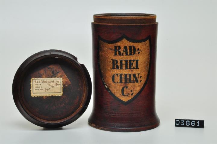 Braune, zylinderförmige gedrechselte Holzdose (Holzbüchse) mit ausgestelltem Standfuß und eingepaßtem, flachem Stülpdeckel mit nach außen gebogenem Profil. Auf der Schauseite schildförmiges und goldfarbenes Beschriftungsfeld mit schwarzem Rand. Schwarz signiert. Enthält geschnittene Rhabarberwurzel.