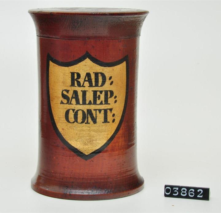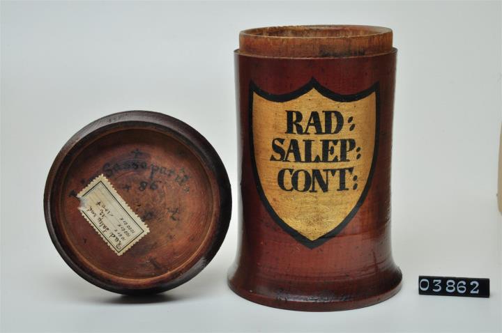 Braune, zylinderförmige gedrechselte Holzdose (Holzbüchse) mit ausgestelltem Standfuß und eingepaßtem, flachem Stülpdeckel mit nach außen gebogenem Profil. Auf der Schauseite schildförmiges und goldfarbenes Beschriftungsfeld mit schwarzem Rand. Schwarz signiert.