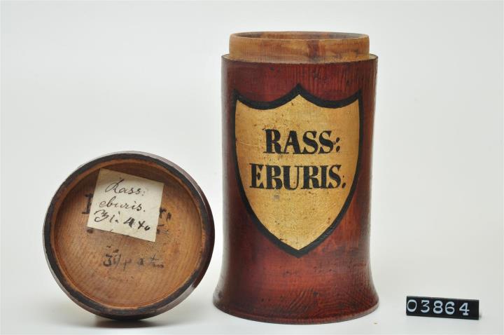 Braune, zylinderförmige gedrechselte Holzdose (Holzbüchse) mit ausgestelltem Standfuß und eingepaßtem, flachem Stülpdeckel mit nach außen gebogenem Profil. Auf der Schauseite schildförmiges und goldfarbenes Beschriftungsfeld mit schwarzem Rand. Schwarz signiert
