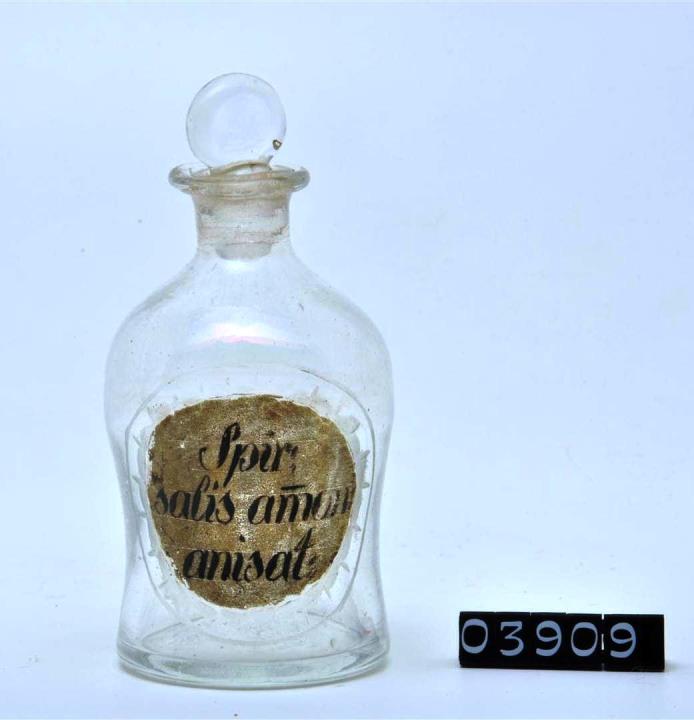 Standflasche aus farblosem Glas mit bauchigem Oberteil und Schliffstopfen mit scheibenförmigem Griff (Massivstopfen). Hefteisenabriss, Mündungsrand mit wulstartiger Verdickung. Ovales Goldschild in Kaltmalerei mit graviertem Dekorrahmen. Schwarz signiert