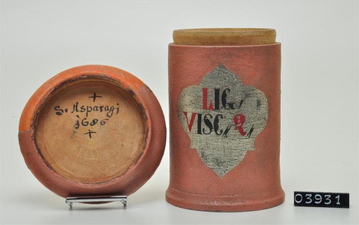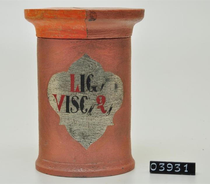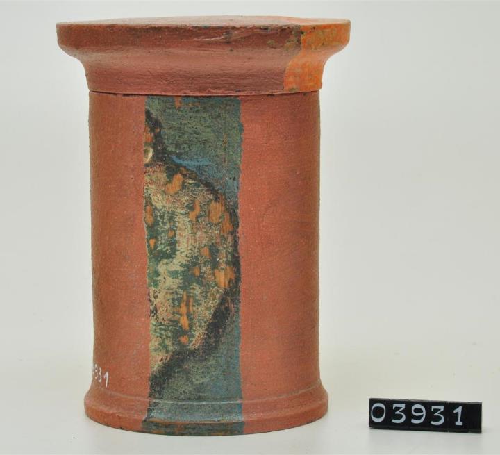 Ziegelrote, zylinderförmige Holzdose (Holzbüchse) mit abgesetztem Standfuß und eingepaßtem, flachem Stülpdeckel mit nach außen gebogenem Profil. Auf der Schauseite dukelgrünes, ausgespartes und geschwungenes Beschriftungsfeld. Rot und schwarz signiert